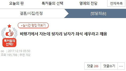 | 비행기에서 자는데 뒷자리 남자가 좌석 세우라고 깨움 (0) | 2017.12.19 |