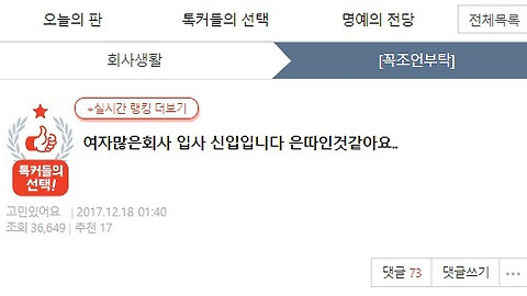 | 여자많은회사 입사 신입입니다 은따인것같아요.. (0) | 2017.12.19 |