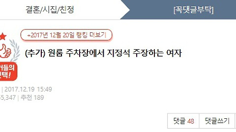 | (추가) 원룸 주차장에서 지정석 주장하는 여자 (0) | 2017.12.20 |