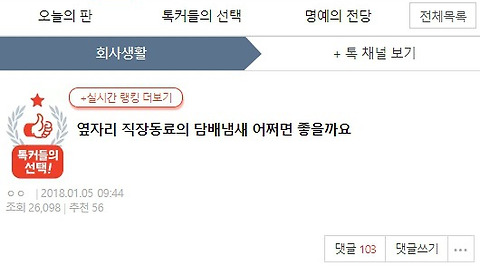 | 옆자리 직장동료의 담배냄새 어쩌면 좋을까요 (0) | 2018.01.05 |