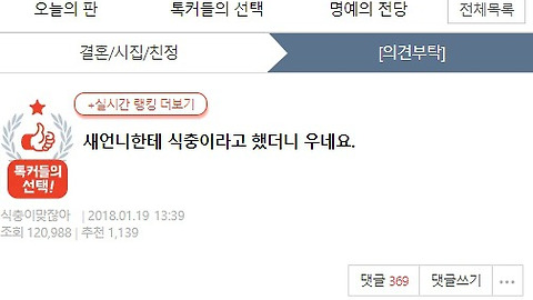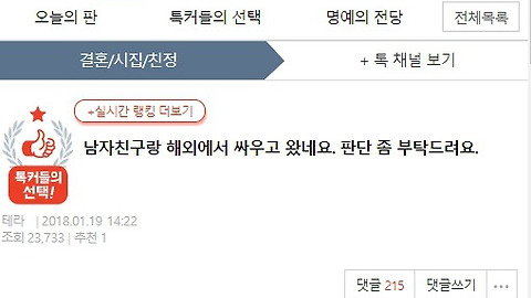 | 남자친구랑 해외에서 싸우고 왔네요. 판단 좀 부탁드려요. (0) | 2018.01.19 |
