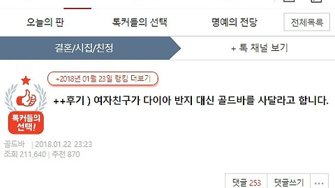 | 후기 ) 여자친구가 다이아 반지 대신 골드바를 사달라고 합니다. (0) | 2018.01.23 |
